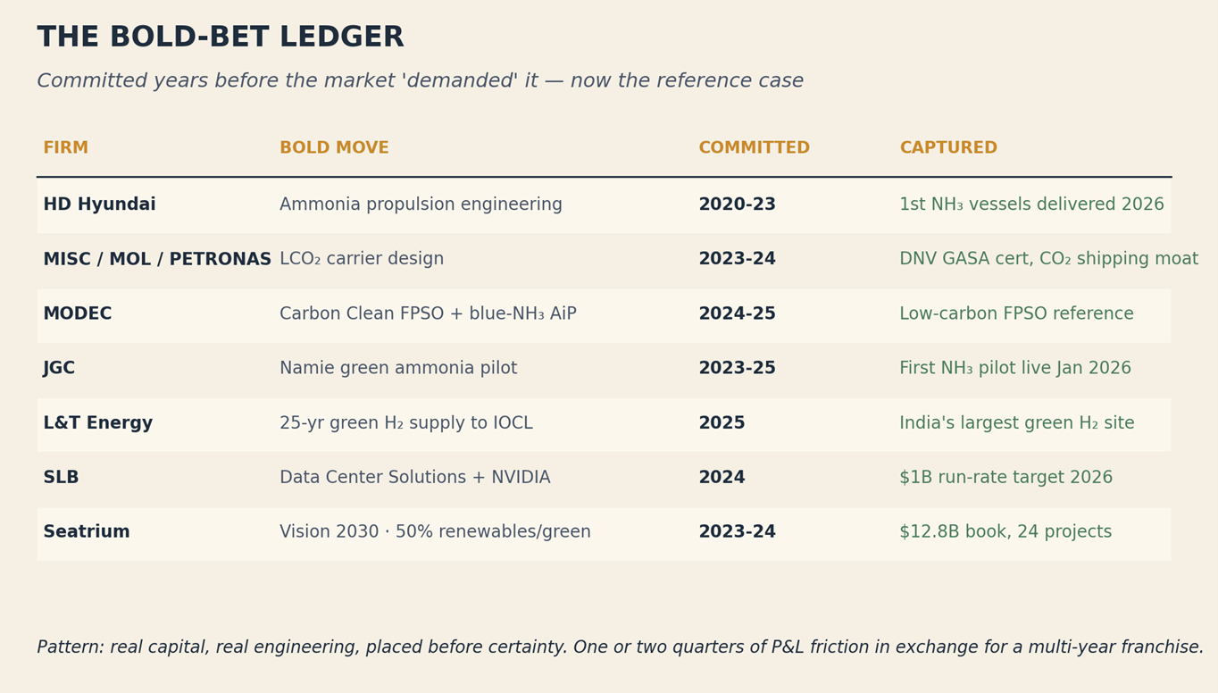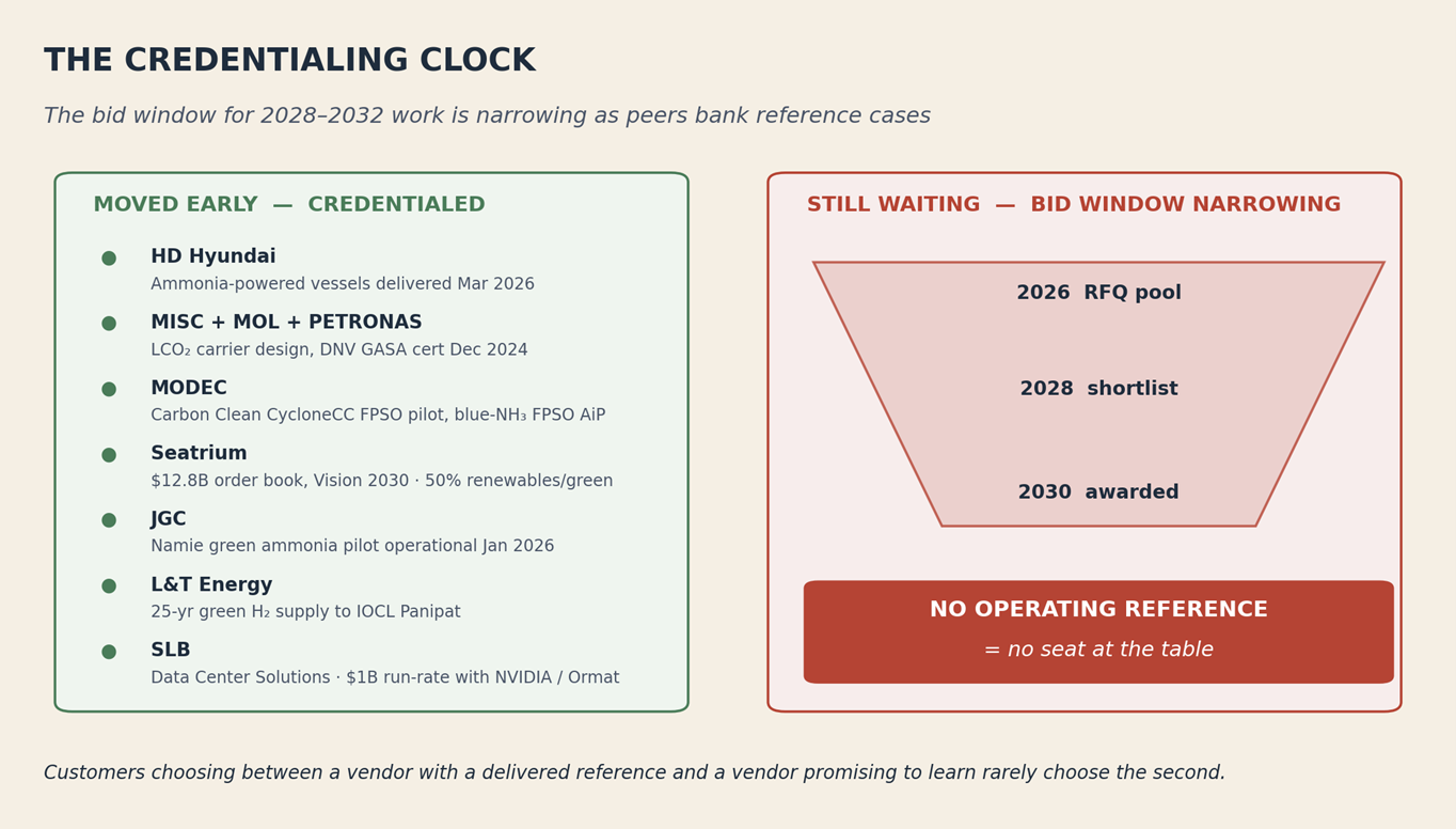 In CCS, ammonia, hydrogen, or offshore-wind installation — something that produces a credentialed operating reference by 2028. This decision separates the peer list above from those still waiting.