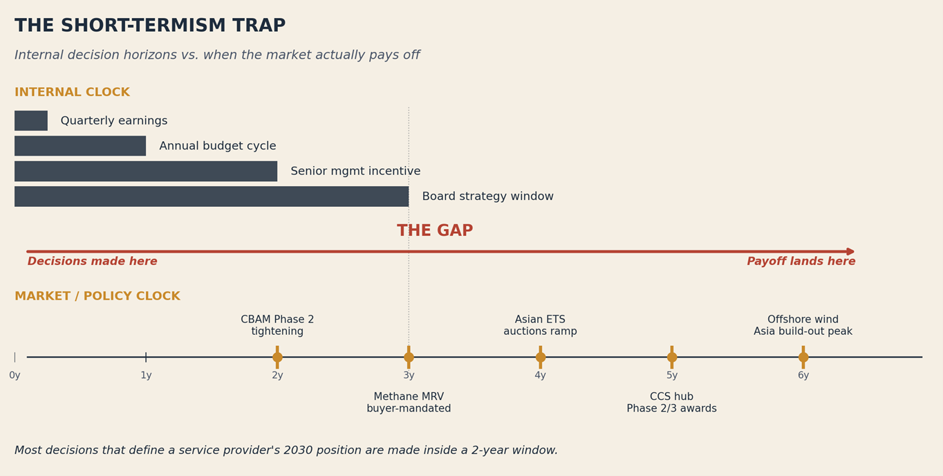 Incentive systems run on 12–18-month metrics. Decisions whose payoff sits in 2029–2030 are made by people whose personal economics end well before then.